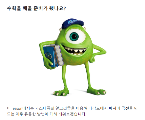 지난 시간 학습했던 선형보간법에 이어 베지에 곡선과 삼차식의 곡선 만드는 원리를 배웠다.